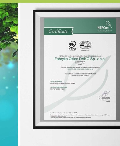 Nous vous informons que la menuiserie en bois DAKO a obtenu la prestigieuse certification écologique PEFC reconnue dans le monde entier. En conséquence, nous avons la possibilité de vendre des produits en bois certifiés. PEFC (Programme for the Endorsement of Forest Certification Schemes) – Programme de Reconnaissance des Certifications Forestières est une organisation mondiale, indépendante et non gouvernementale dont le but est de promouvoir la gestion durable des forêts grâce à la certification indépendante menée. Le certificat PEFC délivré à la menuiserie bois DAKO confirme que le bois contenu dans le produit provient de forêts gérées durablement. La condition pour recevoir le certificat est de répondre à un certain nombre d'exigences en matière de respect des principes de gestion forestière sur l'écologie et le développement durable.