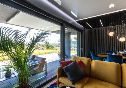 - Depuis chacun des salons, il est possible d'accéder à une terrasse séparée et au jardin commun. Dans les deux cas, les portes-fenêtres HST rendent cela possible. Le seuil bas, la grande surface vitrée et les excellents paramètres d'isolation thermique ont été les raisons pour lesquelles les investisseurs ont choisi les portes coulissantes.