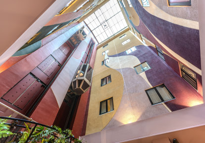 Les couleurs chaudes et saturées de la cour intérieure, avec son ascenseur remarquable, sont complétés par la menuiserie en couleur noir profond . La touche finale est apportée par les détails en forme des charnières et des poignées en argent ou en noir. Le tempérament des propriétaires de l'immeuble se reflète dans la variété des compositions de fenêtres utilisées dans l'ensemble du bâtiment.