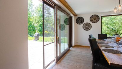 - Depuis le grand salon lumineux qui est le cœur de la maison et la salle à manger élégante on peut sortir à la terrasse avec un espace de détente, une barbecue et une piscine. Dans la salle à manger une baie coulissante HST a été installée qui garantit le passage fluide et sans obstacles ce qui est très pratique pour les locataires. Dans le salon une porte-fenêtre avec un fix a été installée.