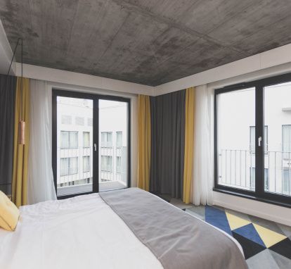 De larges profilés de jonction d'angle ont été retirés de la construction des fenêtres en aluminium DAKO, grâce à quoi deux vitrages se rejoignent à 90 degrés. Ainsi, la surface transparente de la fenêtre augmente, ce qui donne plus de lumière solaire à l'intérieur du bâtiment. La liaison des vitrages dans l'angle est réalisée à l'aide de colle noire, ce qui donne l'effet d'une fine ligne noire et souligne en même temps son caractère. À l'intérieur le vitrage trempé a été utilisé, ce qui garantit le confort d'utilisation et la sécurité maximale.