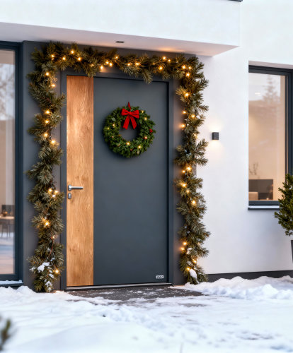 Abychom jemné kouzlo přírodních dekorací ještě zvýraznili, budou v sezoně 2025/26 módní světelné aplikace v podobě pásů, girland a LED „jehliček“, které na povrchu dveří vykreslí vytříbenou hru světla. Díky nim docílíme efektu ranní jinovatky, magického podsvícení a iluze tajících ledových rampouchů. Zajímavý akcent mohou dodat i drobné nalepovací sněhové vločky, které v paprscích světel získají jemný, až šperkový lesk.
