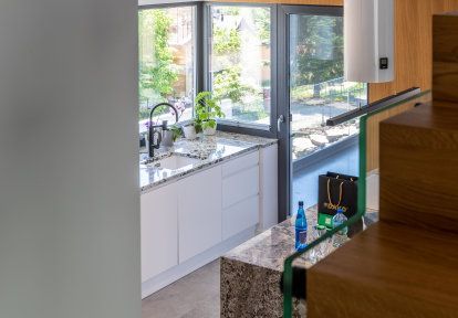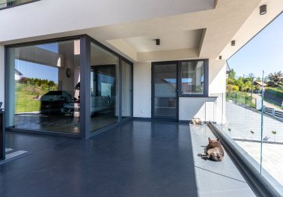 - Individuální projekt domu znamená především velké možnosti designu, které vám umožní vytvořit prostor ideálně přizpůsobený vašim vlastním potřebám. Majitelé domu se rozhodli pro velké množství prosklení, která zajišťuje přístup slunečního světla během dne. V tomto konkrétním případě mají ještě jednu důležitou roli – zaručují působivé výhledy na tatranský masiv v dálce. Investoři se rozhodli pro výrobky vyrobené z PVC. Volba padla na sérii DPQ-82, která se vyznačuje vynikající tepelnou a zvukovou izolací a také velmi vysokou kvalitou zpracování. Ve společné části domu - jídelně, obývacím pokoji a kuchyni bylo rozhodnuto spojit pevná zasklení a balkonové dveře nebo HST terasové dveře. Obzvlášť působivým dojmem působí ten poslední, montovaný v jídelně a vedoucí na terasu. Jejich šířka je až 4,5 metru.