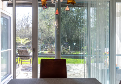 Ústředním bodem budovy je prostorný obývací pokoj s výhledem na terasu, kterého návrh zahrnuje velká prosklení. Kombinace prostoru otevřeného na zahradu s nevýrazným glamour stylem interiérů dodává projektu nádech jemnosti a neopakovatelnosti.