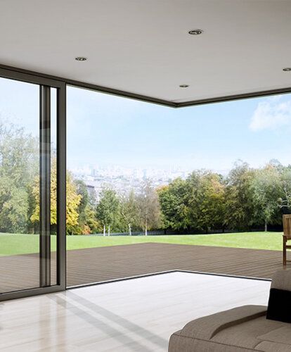 Um einen "Open House"-Effekt zu erzielen, kann man sich dagegen für eine Eck-Terrassentür mit beweglichem Pfosten entscheiden. Wenn man sie öffnet, hat man den Eindruck, als sei ein Teil der Wand des Hauses entfernt worden. Eckige Terrassentüren können auch mit einem festen Pfosten in der Ecke ausgeführt werden, aber bei dieser Art von Lösung ist der Effekt nach dem Öffnen nicht so spektakulär.