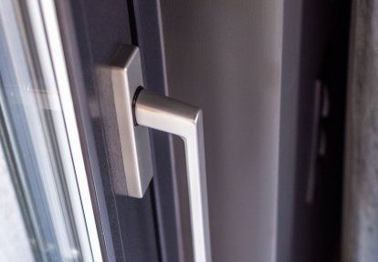 - Alle Bauteile von Fenstern und Türen sind in modernem Dunkelgrau.