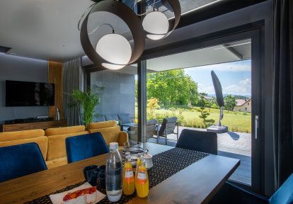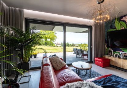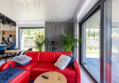 - Aus jedem Wohnzimmer kann man auf gesonderte Terrasse und in gemeinsamen Garten hinausgehen. In beiden Fällen ermöglicht dies die Terrassentür HST. Niedrige Schwelle, groβe Verglasungsfläche und hervorragende wärmedämmende Parameter haben dazu beigetragen, dass die Bauherren eben die Schiebetür gewählt haben.