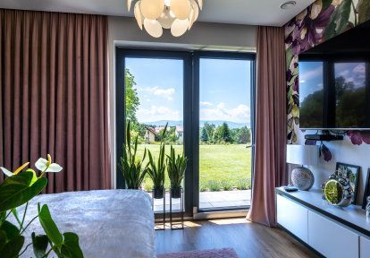 - Die Terrassentür im Schlafzimmer ist eine hervorragende Lösung für Personen, für die Naturnähe und das Hinausgehen in den Garten gleich nach Aufwachen wichtig sind. Diese Hausbesitzer haben deshalb unsere Terrassen-Kipp-Schiebetür HKS gewählt. Diese Lösung sichert nicht nur einen breiten lichten Durchgang, ermöglicht auch die Lüftung der Innenräume dank der Kippfunktion.