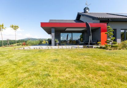 Dies sieht man hervorragend am Beispiel dieses Projekts, wo die grauen Fensterrahmen und Türen ein neutraler Hintergrund für eine auffällige, sehr bunte, eklektische Innenausstattung bilden. Das Dunkelgrau gibt es auch auf der Fassade und an Auβenrollläden, wo es die roten Details der Terrassenüberdachung betont. Alle Bauteile gestalten den ungewöhnlichen, aber sehr einheitlichen Charakter dieses Hauses – der sehr gut das Temperament der Bauherren zeigt.
