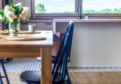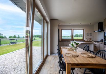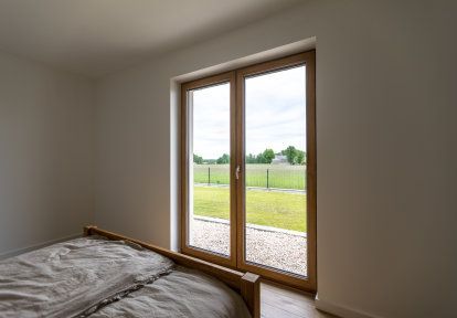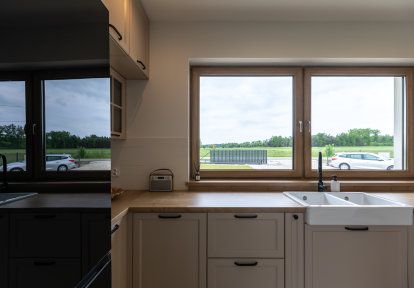 - In Räumen, in denen guter Luftaustausch empfohlen wird, also: in der Küche, im Badezimmer, im Gästezimmer und im Kinderzimmer haben sich die Bauherren für Dreh-Kipp-Fenster entschieden. Diese Lösung ist besonders bequem, da – wenn wir zu Hause sind – können wir die Fenster sperrangelweit öffnen, um die Wohnung schnell zu lüften. Wenn wir schlafen gehen oder das Haus verlassen, können wir die Fenster kippen. Im Schlafzimmer der Hausbesitzer wurde ein Balkonfenster mit beweglichem Pfosten montiert.