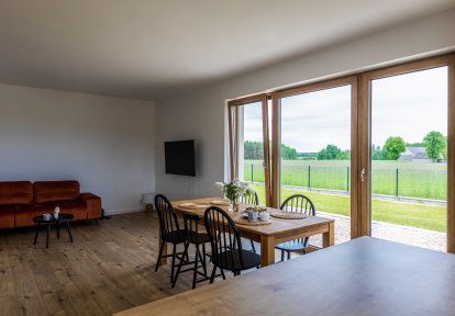 - Im Wohnzimmer haben sich die Bauherren entschieden, zwei Balkonfenster seitlich und eine Festverglasung in der Mitte zu verbinden. Solche Lösung sichert viel Tageslicht im Raum, vergröβert optisch das Gebäude, sieht modern und elegant aus und ist gleichzeitig ökonomisch. Sie ermöglicht auch einen leichten Zugang zum Garten, der sich vor dem Haus befindet.