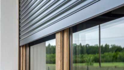 - Alle Fenster im Gebäude haben zusätzlich Unterputzrollläden. Das Vorhaben der Hausbesitzer war bei der Wahl der Farbgebung der Rollläden eine Anknüpfung an die Farbe der Fensterrahmen und des Daches. Die Führungsschienen der Rollläden sind farblich wie die Fensterrahmen und die Rollladenpanzer wie die Dachdeckung, also anthrazitgrau.