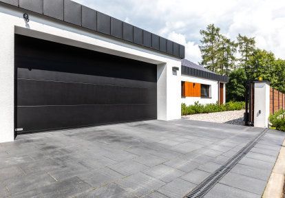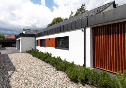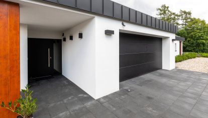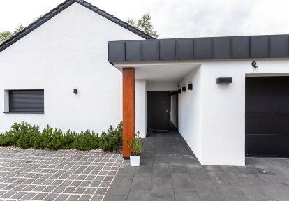 - Die Idee der kohärenten Produktserie HarmonyLine sichert Fenster und Türen in einem Stil. So ist es auch in diesem Fall. Die Fassade des Hauses verziert die Tür Noel mit Aufsatzfüllung, vertikalem Stoβgriff und Seitenlicht und ein doppeltes Garagentor DK-GP Thermo. Beide Produkte wirken modern und passen zu den Fenstern in Schwarz matt. Dank der Anpassung der Produkte im Rahmen der Produktserie HarmonyLine passen alle Details der Produkte –u.a. die gleiche Höhe der Fräsungen der Haustür wie die Paneele des Garagentores - sehr gut zueinander.