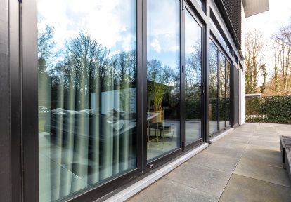 - Die symmetrische Gestaltung der Verglasung, die die beiden Ebenen des Hauses verbindet, unterstreicht den schlichten Baukörper des Hauses. Die im gesamten Gebäude eingebauten Fenster der Serie DA-77 bieten eine gute Isolierung; außerdem haben sich die Eigentümer für eine SUNCOOL-Verglasung entschieden, um ein übermäßiges Eindringen der Sonnenstrahlen in das Innere zu verhindern und die Aufheizung der Räume zu begrenzen.