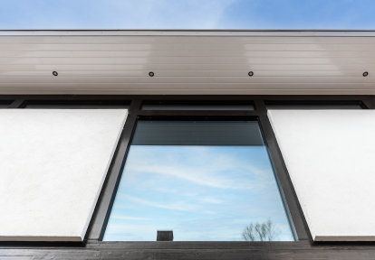 - Zusätzlichen Schutz vor der Sonne bieten die an den Fenstern angebrachten Außenraffstoren. Die aus Aluminium gefertigten Lamellen verleihen dem Gebäude ein leichtes und modernes Aussehen, während ihre vollständig einstellbare Positionierung die Kontrolle über die Menge des in den Innenraum eindringenden Sonnenlichts gewährleistet.