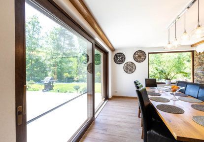 - Vom groβen, hellen Wohnzimmer, das der Mittelpunkt des Hauses ist und stillvollen Esszimmer kann man auf die Terrasse mit einem Erholungsplatz, Grill und Schwimmbad gehen. Im Esszimmer wurde Hebeschiebetür montiert, die flüssigen, barrierefreien Übergang sichert, was zweifellos eine groβe Erleichterung für die Gäste ist. Im Wohnzimmer hat man sich wiederum für mit Festverglasung verbundene Balkonfenster entschieden.