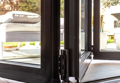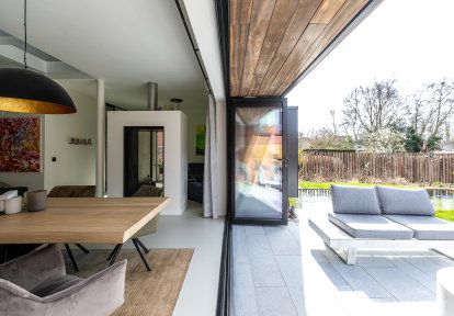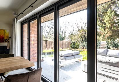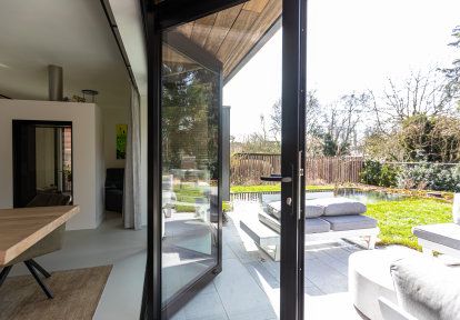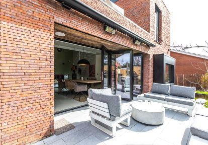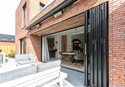 - Auf der Suche nach einer Lösung, die eine möglichst breite Lichtdurchlässigkeit zwischen dem Wohnzimmer und der Terrasse ermöglicht, entschieden sich die Bauherren für eine moderne und besonders eindrucksvolle Lösung - Falttüren. Deren Öffnungsmethode - basierend auf dem seitlichen Falten der beweglichen Flügel - schafft eine unbegrenzte, breite Türöffnung. Die Wahl der Falttüren ermöglichte es, ihre Konstruktion als eine vollständig faltbare Gebäudewand zu nutzen, wodurch der Eindruck einer einheitlichen Verbindung zwischen dem Inneren des Hauses und der Terrasse entsteht.