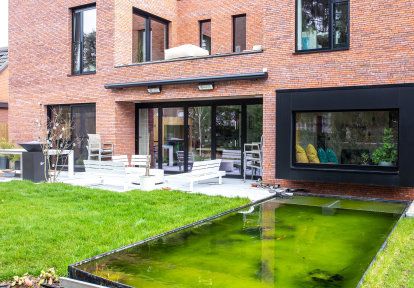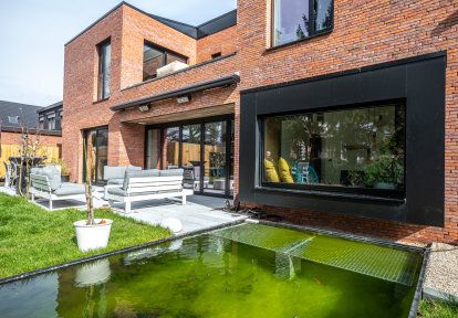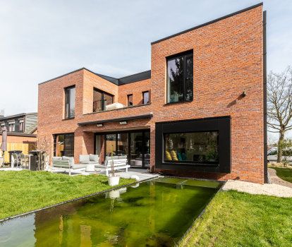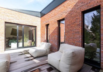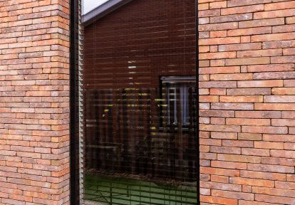 Gebäude mit regelmäßigen, geometrischen Formen werden am häufigsten mit dem modernen Architekturstil in Verbindung gebracht. Diese Art von Design zeichnet sich durch einfache Linien, minimalistische Details und die Verwendung von modernen Materialien aus: Glas, Aluminium und Beton. Die Vorderseite des Hauses hat die Form eines Würfels mit wenigen Fenstern und einem Garagentor, das leicht aus dem Gebäude herausragt. Auf der Gartenseite wurde das Haus vollständig so gestaltet, dass es den Bewohnern maximalen Komfort bietet. Die Fassade wurde aus Ziegeln in verschiedenen Rot- und Brauntönen gemauert, was ihr ein natürliches und großzügiges Aussehen verleiht. Bei der Wahl der Farbe der Bauelemente entschieden sich die Investoren für ein mattes Schwarz, das perfekt mit der Ziegelfassade des Gebäudes harmoniert.