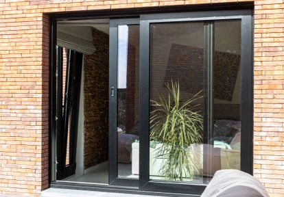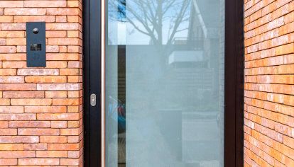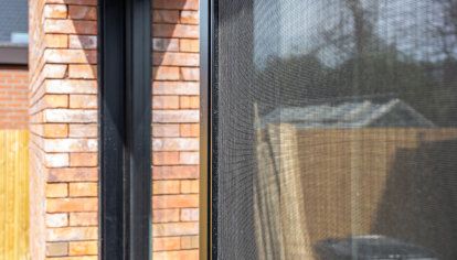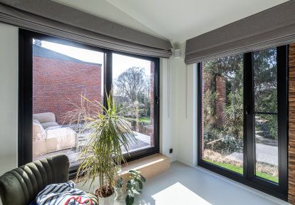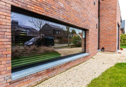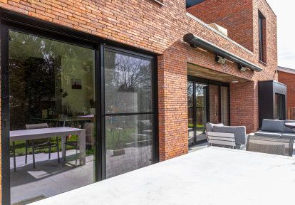 - Die gesamten Bauelemente wurde in einer Farbe schwarz ulti-matt ausgeführt, die perfekt zu modernen Gebäuden passt und in diesem Fall mit der Ziegelfassade des Hauses harmoniert.