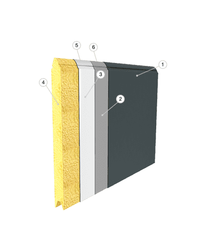 1 - Beschichtung aus Polyester | 2 - Grundbeschichtung/Grundierung | 3 - Verzinkter Stahl Z225 | 4 - Polyurethanschaum | 5 - Verzinkter Stahl Z100 | 6 - Grundbeschichtung/Grundierung.