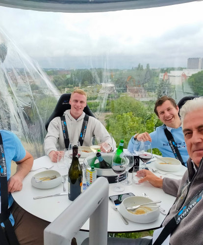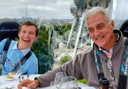 Un dîner élégant dans les nuages « Dinner In The Sky » s'est déroulé en mi-juin à Bruxelles. La plate-forme de cuisson moderne pouvant accueillir jusqu'à 32 personnes était adjacente à l'imposant et légendaire modèle en cristal de fer « Atomium » dans le quartier de Laeken, à la périphérie de la capitale.