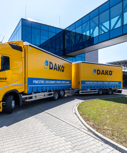 DAKO dispose d'une flotte de transport intégrée composée de camions spécialement aménagés pour le transport de menuiseries. Ces véhicules sont équipés de systèmes de fixation adaptés qui maintiennent les produits en position verticale, limitant les risques de dommages.