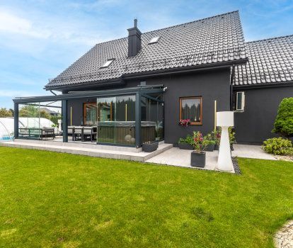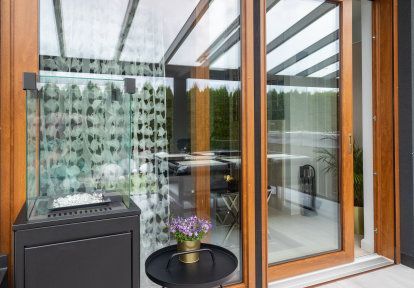 • Les investisseurs ont conçu une grande terrasse couverte de verre qui est un lieu de rencontres familiales jusqu'à tard dans la soirée. Une baie coulissante HST a été installée pour un passage confortable entre l'intérieur de la maison et la terrasse. Le système coulissant à levage de cette construction assure une haute fonctionnalité ainsi que une ouverture et fermeture confortable. La combinaison de baie coulissante HST et de porte-fenêtre deux vantaux fait que le salon est très bien illuminé pendant la journée.
