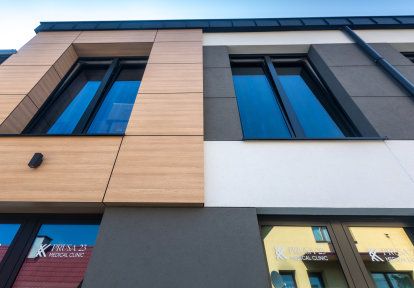 Les possibilités de construction uniques offertes par la menuiserie en aluminium de DAKO ont été utilisées cette fois-ci dans la construction du bâtiment de service Prusa 23 Medical Clinic, offrant des consultations médicales spécialisées à Nowy Sącz. Le projet prévoyait la création d'une façade moderne, réalisée à partir d'une combinaison de verre et d'aluminium. L'élément qui rompt le style brut de la face sont les panneaux de façade imitant le bois.