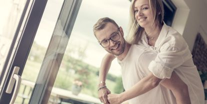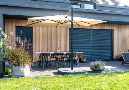 Une grande maison exige des fenêtres de différents types et de différentes tailles. On y trouvera des fenêtres oscillo-battantes typiques, une baie coulissante et des fenêtres fix. Presque toutes les fenêtres sont équipées en volets roulants motorisées. Les investisseurs ont décidé déjà à l’étape de conception qu’ils veulent avoir des volets roulants, pour cela dans la maison le système des volets encastrés a été installé – dans ce système les coffres sont cacheé esthéiquement sous la façade.