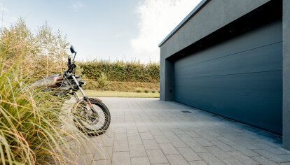 Dans le garage à deux voitures une porte de garage de largeur 5m avec un panneau lisse en couleur gris anthracite (RAL 7016- couleur identique que la couleur de la menuiserie et de porte d’entrée). Vu que la façade de garage a été faite en couleur très proche , la porte de garage ne saute pas trop aux yeux malgré ses gabarits.