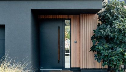 Réalisation DAKO : une maison selon le projet individuel, les fenêtres en couleur gris et les finitions en bois.