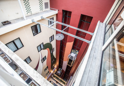 Les couleurs chaudes et saturées de la cour intérieure, avec son ascenseur remarquable, sont complétés par la menuiserie en couleur noir profond . La touche finale est apportée par les détails en forme des charnières et des poignées en argent ou en noir. Le tempérament des propriétaires de l'immeuble se reflète dans la variété des compositions de fenêtres utilisées dans l'ensemble du bâtiment.