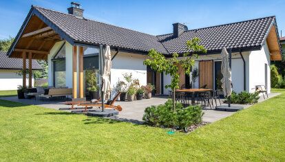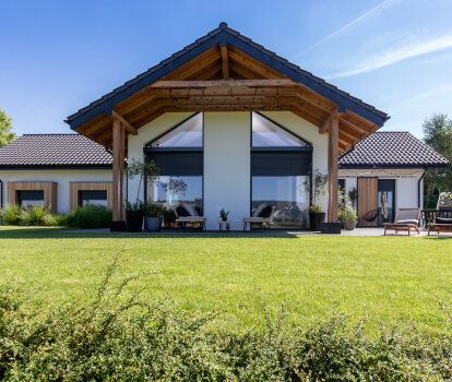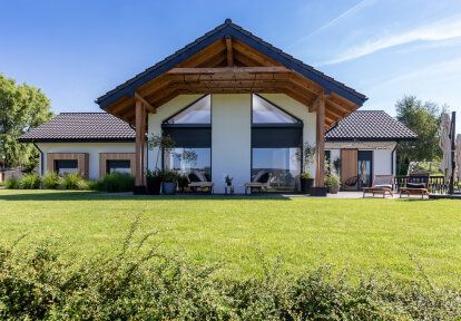 Les investisseurs ont choisi les fenêtres fabriquées en PVC avec le plaxage en couleur gris anthracite lisse. Dans les fenêtres (également celles typiques et dans les portes-fenêtres) ainsi que dans baies coulissantes les volets roulants ont été installés. Ils améliorent l’isolation thermique des fenêtres et ils rendent la tentative de cambriolage plus difficile (ce qui est important car en cas des maisons plain-pied les cambriolages se font souvent par la fenêtre ou par les portes de terrasse) ils assurent l'obscurcissement total des pièces - ce qui est particulièrement important par exemple dans la chambre à dormir.
