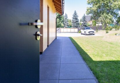 Quant aux portes d’entrée nos clients ont choisi une porte d’entrée moderne en aluminium- modèle NOEL. La porte grise a été assortie à la couleur des fenêtres, elle est équipée en plus d’un imposte latéral qui éclaire l’entrée ainsi que d’un bâton de maréchal original.