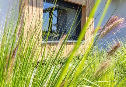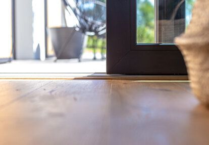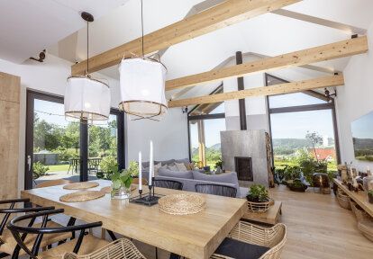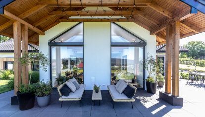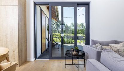 La maison a été conçue pour trois personnes - un couple marié avec leur fils d'âge scolaire. Les fenêtres et les portes devaient correspondre à l'aspect moderne du bâtiment et à la décoration intérieure – des meubles simples mais élégantes, des sols en bois, des espaces ouverts. Les clients souhaitaient en particulier que la menuiserie ait de bons paramètres thermiques, pour qu’elle soit adaptée au plan et à la destination des pièces et pour qu’elle donne en même temps un effet esthétique cohérent.