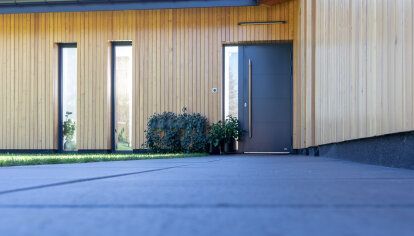Les investisseurs tenaient à un effet global cohérent pour que tous les éléments de la menuiserie soient bien assortis – alors ils ont passé une commande globale non seulement pour les fenêtres et la porte mais aussi pour la porte de garage sectionnelle en même couleur que les autres éléments de la menuiserie.