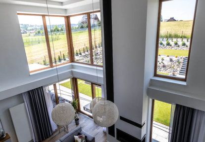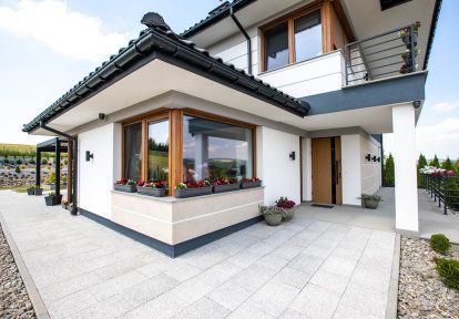 Située sur une petite colline, cette maison à deux étages impressionne de l'extérieur par sa forme moderne et lumineuse. Elle a été construite sur la base d'un projet individuel des investisseurs qui souhaitaient ouvrir le bâtiment sur le jardin et le magnifique panorama du Beskid Sądecki.