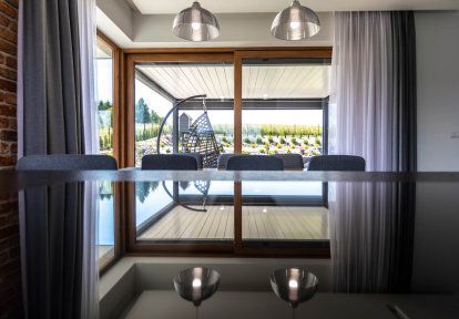 - La facilité d’utilisation, excellents paramètres d’isolation thermique et un seuil plat confortable ont décidé de choix de baie coulissante à levage HST que les investisseurs ont décidé d’installer dans le salon et dans la salle à manger combinée à la cuisine. La baie coulissante offre le maximum de passage ainsi que la possibilité d’ouvrir les pièces sur le jardin. Grâce à l’utilisation de cette solution, la terrasse est devenue une zone de détente pour les habitants et un lieu préféré pour passer le temps libre les après-midi d'été.