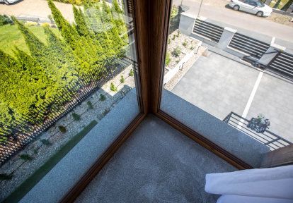 - La couleur de la menuiserie de fenêtres est un complément de la façade claire - les investisseurs en commandant les fenêtres, les volets roulants et les baies coulissantes ont choisi le plaxage en couleur imitation du bois winchester. La couleur doré du plaxage avec une structure caractéristique ressemblante à la structure du bois décore l’apparence de la maison non seulement de l’extérieur mais aussi de l’intérieur.