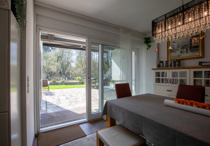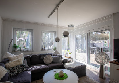 Le point central de la maison est le salon spacieux donnant sur la terrasse , le salon a été conçu avec la place pour de grands espaces vitrés. La combinaison de l’espace ouverte sur le jardin et du style glamour discret des intérieurs confère à l'ensemble une touche de finesse et d'originalité.