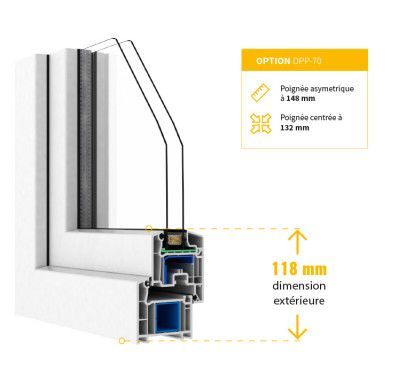 Professionnels de la menuiserie, faites le choix de la performance avec les fenêtres PVC DPP-70 de DAKO. Dotées d'un profilé à 5 chambres, d'une épaisseur de 70 mm et d'un double vitrage de haute qualité, elles offrent une isolation thermique (Uw = 1,25 W/m²K) et une sécurité renforcée avec des gâches anti-effraction.