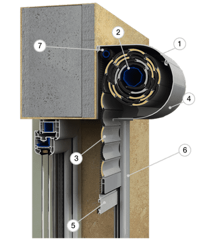1 – Coffre du volet | 2 – Arbre d’enroulement | 3 – Tablier | 4 – Trappe de visite | 5 – Lame finale | 6 – Coulisse | 7 – Moustiquaire - en option