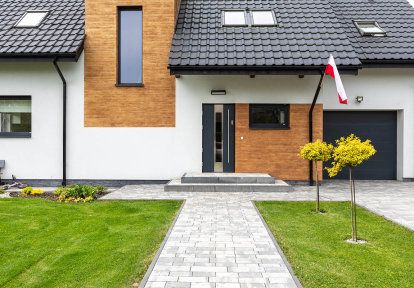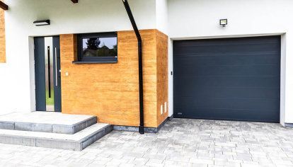 In linea con la porta d'ingresso sulla parete anteriore si trova il portone da garage goffrato (pannello altamente goffrato DK-WPP). Il comfort di utilizzo del portone è assicurato dall'automazione che viene controllata con un telecomando senza fili. Tuttavia, non sempre lo abbiamo con noi, per queste situazioni, gli investitori hanno installato un tastierino numerico senza fili aggiuntivo: è sufficiente inserire un codice predefinito e il portone si aprirà. Il secondo portone da garage, manuale, è stato installato nella casetta ripostiglio. Questa soluzione rende estremamente facile per i proprietari tirare fuori biciclette o attrezzature necessarie alla cura del giardino, ad esempio il tosaerba.