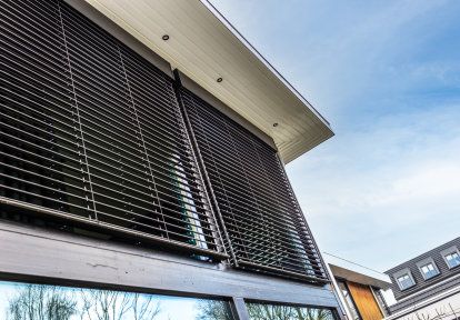 Le persiane esterne installate alle finestre offrono un’ulteriore protezione dal sole. Le lamelle in alluminio conferiscono all’edificio un aspetto leggero e moderno, mentre la possibilità di regolare pienamente la loro posizione offre il controllo della quantità di luce solare che entra nell’edificio.