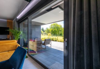 La porta per terrazza nella camera è una soluzione eccellente per le persone che apprezzano la vicinanza con la natura e la possibilità di accedere facilmente al giardino. I proprietari della casa hanno scelto a tale scopo la porta scorrevole e ribaltabile HKS. Questa soluzione garantisce non solo molta luce, ma anche la facilità di ventilazione grazie all’apertura a ribalta.