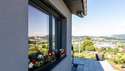 Questa realizzazione ne è un buon esempio: le finestre e le porte grigie fanno da sfondo neutro a un design d'interni audace, pieno di colori ed eclettico. Il grigio scuro è stato applicato anche nella finitura della facciata e delle tapparelle esterne, in quel modo evidenzia il particolare rosso sotto forma di tettoia per le terrazze. Tutti gli elementi formano il carattere insolito ma molto coerente dell’edificio, che riflette perfettamente il temperamento degli investitori.