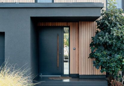 Per quanto riguarda la porta d'ingresso, gli investitori hanno optato per un design classico e semplice di porta esterna in alluminio che si adatta perfettamente alla casa e allo stesso tempo riflette il carattere degli abitatnti che apprezzano il minimalismo e la natura.