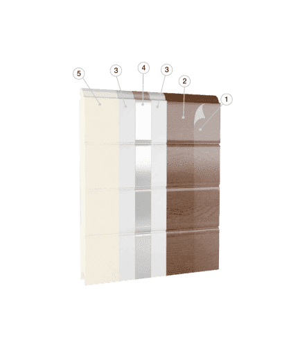 1 - Film di protezione | 2 - Rivestimento organico | 3 - Galfan | 4 - Acciaio | 5 - Schiuma di poliuretano