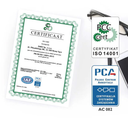 DAKO verkreeg na een nauwgezette, externe controle het certificaat ISO 14001. De ISO 14001 certificering maakt inzichtelijk dat DAKO haar verantwoordelijkheid neemt ten opzichte van het milieu en ook daadwerkelijk voldoet aan milieuwetgeving die van toepassing is in de branche.