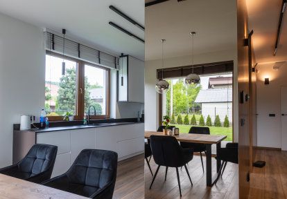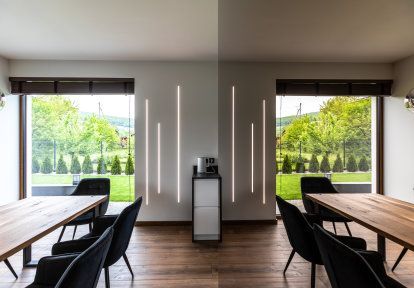 - In de gehele woning vinden we ramen uit de serie DA-77 terug. Deze serie kenmerkt zich vooral door de enorme afmetingen die in een constructie toegelaten zijn, en een moderne vormgeving die goed past in de hedendaagse woningbouw. Ook de warmte- en geluidsisolatie is in deze ramen uitstekend. In de gastenkamers, keuken, badkamer en garage kozen de eigenaars voor draaikiepramen. Deze oplossing vergemakkelijkt het ventileren van de ruimtes, maar ook het reinigen van de ramen.